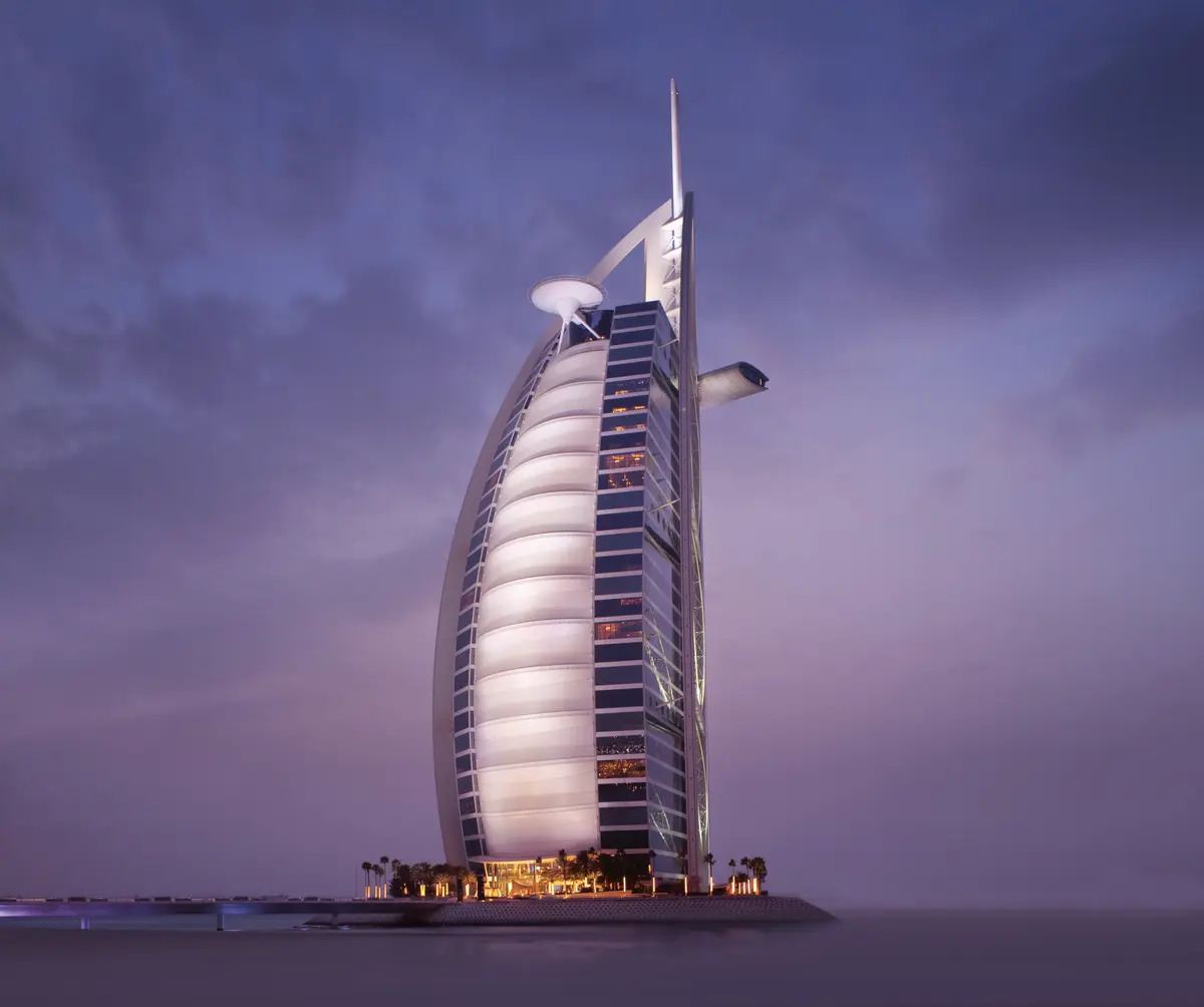 Salah satu ikon Dubai yang terkenal dengan desain bangunannya yang menyerupai layar kapal. Hotel ini memiliki 60 lantai dengan total ketinggian mencapai 321 meter. Kamar termahalnya, Royal Suite, dibanderol dengan harga sekitar Rp 445 juta per malam.